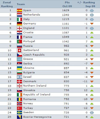 Uluslararası Futbol Federasyonları Birliği (FIFA), Ekim ayı dünya sıralamasını açıkladı. Türkiye bir önceki aya göre 12 sıra gerileyerek, 737 puanla 39. sıraya gerilerken, Brezilya liderliğini sürdürdü. FIFA'nın internet sitesinde yer alan habere göre, 8. FIFA Konfederasyon Kupası'nda şampiyon olmasının ardından, Haziran ayında İspanya'nın 11 aylık liderliğini elinden alan ve son olarak da Güney Amerika elemelerini zirvede tamamlayarak, 2010 Dünya Kupası'na katılmaya hak kazanan Brezilya, 1632 puanla Ekim ayı sıralamasında zirveyi kimseye bırakmadı. Ekim ayı sıralamasında, bir önceki aya göre çok büyük düşüş gösteren Türkiye, Eylül ayı sıralamasında 826 puanla 27. sırada yer almışken, bu ayki sıralamada 12 basamak düşerek, 737 puanla 39. sırada kendine yer buldu. Sıralamada zirvedeki 4 takımın yeri değişmezken, 2010 Dünya Kupası Avrupa Elemeleri 5. Grup'ta Türkiye ile de mücadele eden Ermenistan, 25 basamak birden yükselerek 100. basamağın bu ayki sahibi oldu.