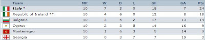Haftasonu oynanan maçta en yakın takipçisi İrlanda ile berabere kalarak 4 puanlık farkı korumuştu İtalya ve grup liderliğini, dolayısıyla Güney Afrika yolunda playoff engelini aşmayı garantileyen takımlardan birisi olmuştu. Dün akşam oynadığı son maçta ise Güney Kıbrıs'ı 3-2 mağlup etti. İrlanda da geçtiğimiz maçta grup ikinciliğini yani playoffları garantilemişti. Zira en yakın takipçisi Bulgaristan ile arasında 4 puan fark var. Son maçlarda İrlanda ise sahasında Karadağ ile 0-0 berabere kaldı.