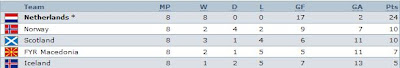 Diğer gruplardan bir eksik olarak başlayan dokuzuncu grup Dünya Kupası'na da bir eksikle takım gönderiyor yine diğer gruplardan farklı olarak. Hollanda bu grubu domine eden takım oldu. Yaptığı 8 maçın 8'ini de kazanarak 24 puan topladı ve 9. grubu Güney Afrika'da temsil etmeye hak kazanan takım oldu. Grubu 10 puanla ikinci sırada tamamlayan Norveç ise 'En iyi 8 ikinci' arasına kalamadı ve playoff maçı oynayarak 2010 Dünya Kupası'na katılma şansını devam ettiremedi. Norveç'te bildiğin ezilmiş yahu :) Neyse laf etmeyelim sonra adama dinime küfreden müslüman olsa derler. Sanki Norveç'e laf edecek halimiz varmış gibi..