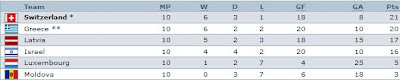 Grubu domine eden iki ekip olan İsviçre ve Yunanistan arasında geçen birincilik mücadelesini İsviçre kazandı. İsrail ile sahasında 0-0 berabere kalan İsviçre, lider olarak 2010 Dünya Kupası'na doğrudan katılmaya hak kazandı. Yunanistan ise sahasında Lüksemburg'u 2-1 mağlup ederek playoff vizesi aldı. İsviçre, İsrail ile berabere kalarak puanını 21'e yükseltirken, Yunanistan, Lüksemburg'u yenerek puanını 20'ye yükseltebildi ancak. Gruptaki diğer takımlardan Letonya 17 puanda, İsrail ise 16 puanda kaldılar.
