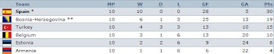 Kara grup dedikleri bu olsa gerek. Tabi sadece bizim için kara. İçimden yazmak gelmiyor zaten kısaca geçeyim. Tıpkı 4. grup gibi bizim grupta da Güney Afrika'ya gidecek takımlar sondan bir önceki maçlarda belli olmuştu zaten. İspanya'nın açık ara liderliğini garantilediği ve Bosna Hersek'in de Cumartesi günü playoff vizesi aldığı grupta, İspanya son maçında Bosna'yı deplasmanda 5-2 mağlup etti ve 10'da 10 yaparak grubu 30 puana tamamladı. Bosna ise 19 puanda kaldı. Bir süredir Barcelona antipatimi yazıyorum zaten takip edenler bilirler. Aynı antipatiyi İspanya'ya da besliyor olmam tesadüf değildir sanırım. Neyse..