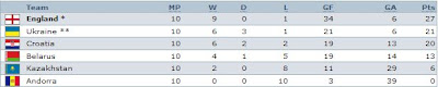 İngiltere'nin Güney Afrika'ya gideceği geçtiğimiz maçlarda belli olmuştu zaten. Fakat sondan bir önceki maçta cumartesi gecesi Ukrayna'ya yenilmesi bir çok çevrede tepkiyle karşılanmıştı. Zira Ukrayna futbol takımı tarihinde İngiltere'yi hiç yenmemişti ve İngiltere'nin bu maçta çok kasmayacağı söyleniyordu. Sonuç olarak Ukrayna, İngiltere'yi mağlup ederek playoff için büyük şans yakaladı. Son maçlarda ise Andorra'yı deplasmanda 6-0 yenen Ukrayna, Hırvatistan'ın deplasmanda Kazakistan'ı 2-1 yenmesine rağmen grubu ikinci sırada tamamladı ve playoff vizesi aldı. İngiltere ise Belarus'u 3-0 yenerek elemeleri 27 puanla tamamladı.