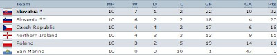 Slovenya ile Slovakya arasında ciddi bir çekişme oldu bu grupta. Buna birde Çek Cumhuriyeti eklenince en büyük rekabetlere sahne olan gruplardan birisi oldu 3. grup. Fakat Slovakya'nın son anda Polonya'yı deplasmanda 1-0 yenmesiyle puanını 22'ye çıkardı. Slovenya ise San Marino'yu yenerek 3. gruptan playofflara çıkmaya hak kazanan takım oldu. Bu grubun hayal kırıklığı ise şüphesiz Çek Cumhuriyeti'ydi. Cech'in takımını Avrupa Şampiyonası'ndan sonra Dünya Kupası'nda izleyemeyecek olmamız can sıkıcı gerçekten. Şimdi farkettim Çek Cumhuriyeti ile tuhaf bir benzerliğimiz var. Enteresan..