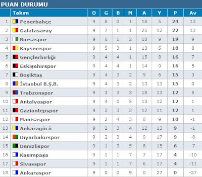 Denizlispor : 2-3 : Bursaspor; Ertuğrul Hoca ve ekibi geçen sene takımı devraldıklarından beri gerçekten çok başarılı işler yaptılar. Geçen yıl neredeyse ilk 5 içinde yer alacaktı fakat olmadı. Yine de müthiş sezon geçirdiler. Bursa bu sene de lige iyi başlayan takımlardan birisi oldu. 8 maçta yalnızca 2 mağlubiyeti vardı. Bu maçtan önce Shin Young'ın takımı bırakıp gitmesi, Sercan'ın oynayamaması Bursa'nın hücum yolundaki hızını bir hayli kesmişti. Fakat benim de en sevdiğim futbolculardan birisi olan Volkan takımı başarılı bir şekilde taşıdı diyebiliriz. Volkan maçta gol atmasa da takımın hücumdaki en önemli silahlarından birisi oldu. Denizli'ye dönecek olursak; hükmen galip geldiği Ankaraspor maçı dışında galibiyeti yoktu. Maçın 90 dakikası 2-2'lik eşitliklikle geçildikten sonra Zapo uzatmalarda Bursa'yı galibiyete taşıyan golü atan ve Bursa'ya 6. galibiyetini kazandıran isim oldu.