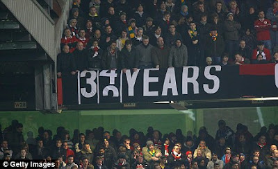 Başlıktaki espri Oğuz'a ait. Zaten fotoğraf da onun blogu Barbarossa'dan. Geçtiğimiz günlerde Carling Cup yarı finalinde Manchester derbisi izledik. United, City'i Old Trafford'da tokatlayıp gönderdi. City 33 senedir Carling Cup'ı kazanamıyor. Bu mağlubiyet ile 34. seneye döndüler artık. United taraftarı da bu olayı bir pankarta dökmüş. İngiltere Kupasını 34 senedir kazanamama, komşu takımlar, mavi ve kırmızı.. Bunlar bana bir yerden tanıdık geliyor :p Ne mutlu kırmızıyım diyene :))