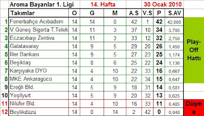 Aroma Bayanlar 1.Voleybol Ligi 14.Haftasında oynanan maçlar ve puan durumu şöyle: