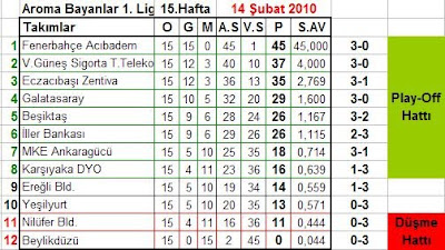 Aroma Bayanlar 1.Ligi 15. haftasında oynanan karşılaşmalar ve oluşan puan durumu: