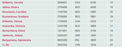 Avustralya Açık'ın bitmesinin ardından, ocak ayında yeniden oluşan klasmanlar geçtiğimiz günlerde açıklandı. Önce kadınlardaki sıralamayı konuşalım istiyorum. Geçtiğimiz sezonun şampiyonu Serena Williams, Avustralya Açık'ı da kazanarak birinci sıradaki yerini korudu. Aşağıda sıralama fotoğrafında da göreceksiniz, en yakın rakibi Safina'nın elenmesinin ardından topladığı puanlarla da rakibiyle arasındaki farkı bir hâyli açtı. İlk onda en hızlı yükselişe sahip raket ise 17. sıradan 10. sıraya yükselen Na Li oldu. Çinli raket, Avustralya Açık'ın yarı finalinde, şampiyon Serena'yı tie-breaklere götürse de set alamayarak elenmekten kurtulamamıştı. Yine de son 16'da Wozniacki'yi, çeyrek finalde ise Williams'lardan Venus'u yenerek geldiği yarı finale kadar gösterdiği mücadele takdir edildi. İşte kadınlarda ilk 10;