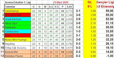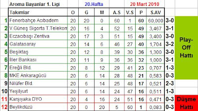 Aroma Erkekler 1.Ligi 22. haftasında oynanan karşılaşmalar ve oluşan puan durumu: