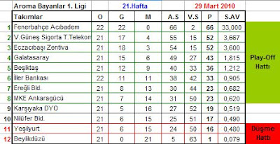 Aroma Bayanlar Voleybol 1.Ligi bu hafta oynanacak olan maçlarla tamamlanacak. Son haftanın ilk maçı 29 Mart Pazartesi günü oynandı ve F.Acıbadem deplasmanda İller Bankası Takımını 0 – 3 yendi ve ligi lider tamamladı.