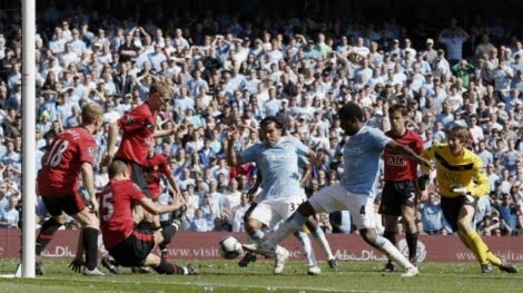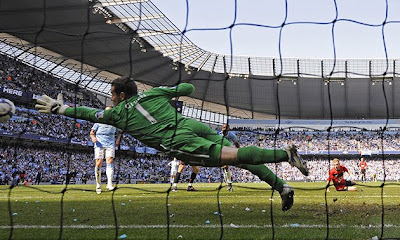 Maça dönecek olursak aslında ortada bir maç olduğunu söyleyebiliriz. İlk yarısını United'ın ikinci yarısını City'nin domine etti. Güneşi arkasına alan iyi oynuyordu. Fletcher ve Rooney'in kaçırdığı gollerin şanssızlıktan başka nasıl açıklanacağını bilmiyorum, City'nin pek atağı olmadı ilk yarıda. Fakat ikinci yarıda öyle bir gol kaçtı ki maviler adına, maçın kırılma noktası diyebiliriz. Yukardaki fotoğrafta bu kırılma anından bir enstantane var. Bellamy'nin sol kanattan kullandığı korner sonucunda ceza sahası içinde müthiş bir karambol yaşandı. Önce pozisyonu Van der Sar'ın engellediğini, sonraysa Vidic'in adeta kendisini siper ederek topun kaleye girmesini engellediğini gördük. Son olarak da Scholes topu ceza sahası dışına atarak defansı rahatlatan isim oldu. İki tarafın da gol aradığını fakat sonuca bir türlü ulaşamadığını gördük maç boyunca.