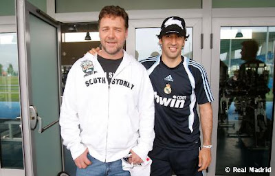 Russell Crowe geçtiğimiz günlerde Real Madrid antrenmanını ziyaret etti. Cristiano Ronaldo, Guti ve Raul ile de pozlar verdi. Casillas'ın forma numarası olan 1 ile kendisine hazırlanan forma da hediye edildi. Robin Hood adlı hikayenin günümüze uyarlanmış filminde başrol oynayacak olan aktör, filmin tanıtımı çerçevesinde geldiği İspanya'da Real Madrid tesislerini ziyaret etti. Rugby hayranı olduğunu söyleyen Avustralyalı aynı zamanda tutkulu da bir futbol izleyicisiymiş ve İspanya'da Barcelona ile Real Madrid'in ligdeki yerlerini takip edermiş sürekli. O günden bize de bu fotoğraflar kaldı.