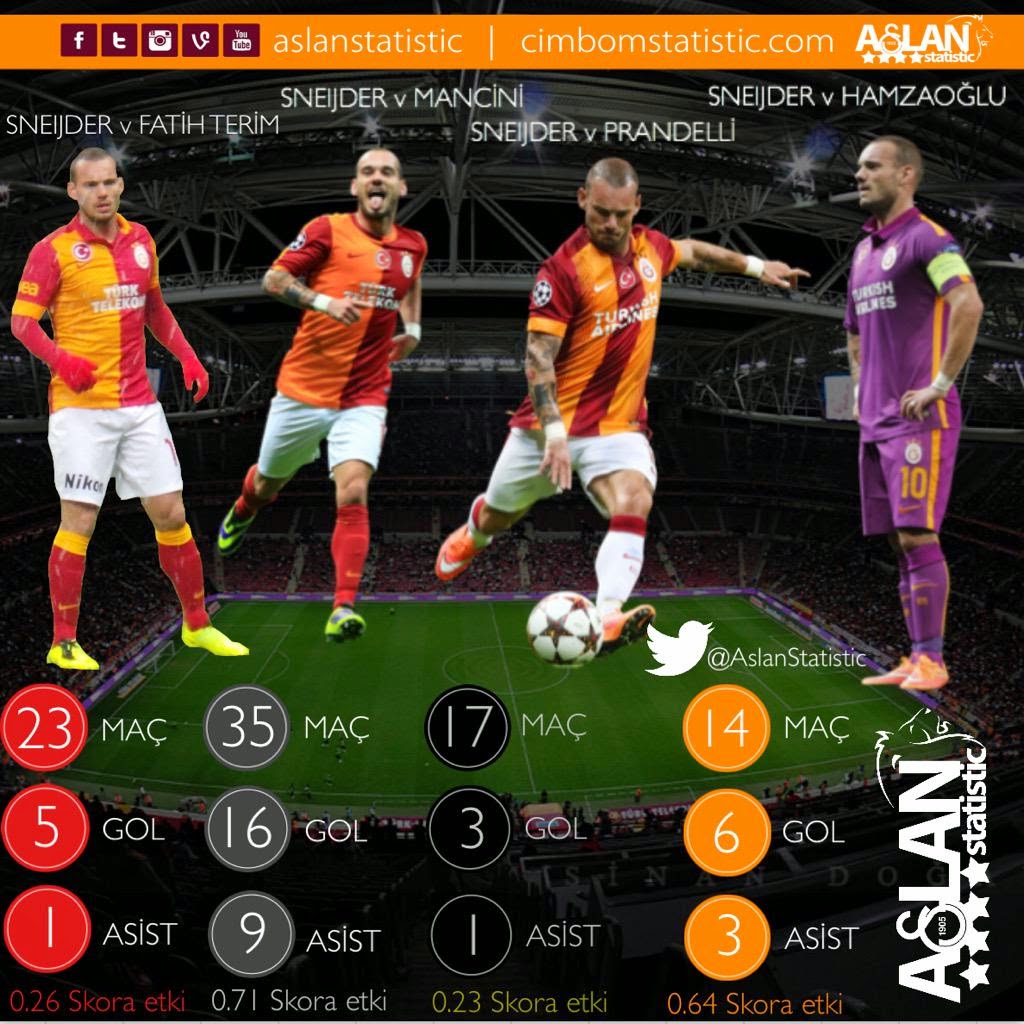 Geçtiğimiz günlerde Sneijder'in hangi teknik adamla daha iyi performans gösterdiği üzerine konuşuyorken Aslan Statistic yine bombayı saldı ve istatistiği önümüze koydu. Galatasaray forması giydiği 2.5 sezon içerisinde 4 farklı teknik direktörle çalışan Sneijder'in hangi teknik adamla ne yaptığı üzerine mükemmel bir istatistik karşımızda.